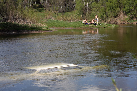 Выходим в 10. Опять теплый майский день, но, кажется, что собирается дождь. Так и не собрался. Мы специально запланировали выезжать пораньше, чтобы не бодаться с дачниками. Ближе к Оке шиверы становятся мощней, но не глубже. Обносим недавно сооруженный низкий мост. На последнем участке реки полно шивер и отмелей. Многочисленные рыбаки сопереживают, подбадривают. Проходим два высоких моста. Перед Окой удачно прыгаем с плотинки, образованной лежащими поперек реки трубами – повезло, пронесло, никаких лишних железок не попало под днище. Около 11 выплыли в Оку - бежит хорошо. На высоком берегу справа видны церковь в городе Таруса, памятник и дома. Перед антистапелем мы перешли Оку и искупались на шикарном пляже напротив Тарусы. Лодку разбирать стали, пройдя 100 метров вверх по Оке, - под памятником, чуть ниже гимса (не заинтересовали). До автобусной остановки очень близко. Через полчаса сели в маршрутку и к 14 часам были в Серпухове. Чуть-чуть опоздали на электричку из-за промедления с отъездом из Тарусы водителя маршрутки. Следующая электричка только в 15-15, но зато до Новоиерусалимской. Во время ожидания отдали должное серпуховским пирожкам (киоск прилеплен справа к вокзалу). Затем доехали за 100 руб. не спеша, без переходов в метро и пр. перекладных прямо до родного Покровского-Стрешнева. Дома были в 18.