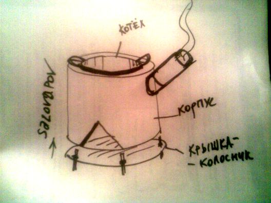 Могу вам дать творческий совет. Похожую и более стойкую вещь можно легко изготовить как и у Каземирова из кастрюли с крышкой(!) только установить её нужно вверх дном, а в днище врезать кастрюльку меньшего диаметра с2-х милиметровой свободой.  Крышку использовать в качестве колосника, прорезав в ней соответствующие пропилы и установив четыре ножки-болты в близи кромки корпуса( пятый в центре).Ножки, уходящие во внутреннюю часть печи, не дадут ползать корпусу печи по крышке.можно не делать колосник, тяга будет через топку, и прожиг на грунте  будет минимальный. Дымоход сделать как у "Дымка" из старого термоса или из любого свёрнутого листа стали, можно для простоты из консервной банки. Топку вырезать снизу двумя пропилами под прямым углом. Это будет печь с фиксированным погружным котелком. При дальнейшей разработке этой печи можно предусмотреть и сменные шаблоны для других котлов.