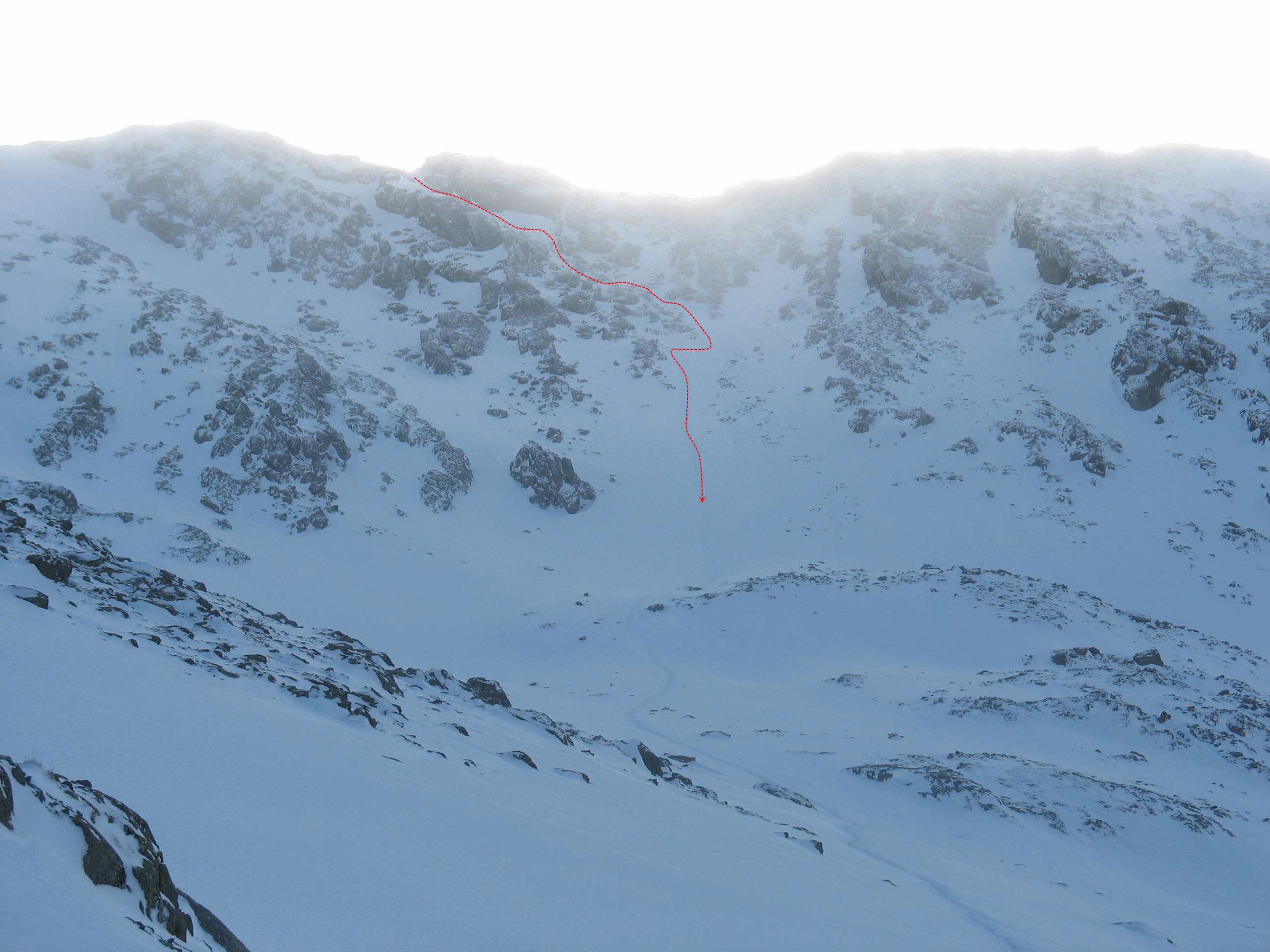 А Вы спускались с седловины в сторону мультинского озера, как указано на этой фотографии (по красному пунктиру) или немного западнее (как бы по середине этой фотографии)?++
