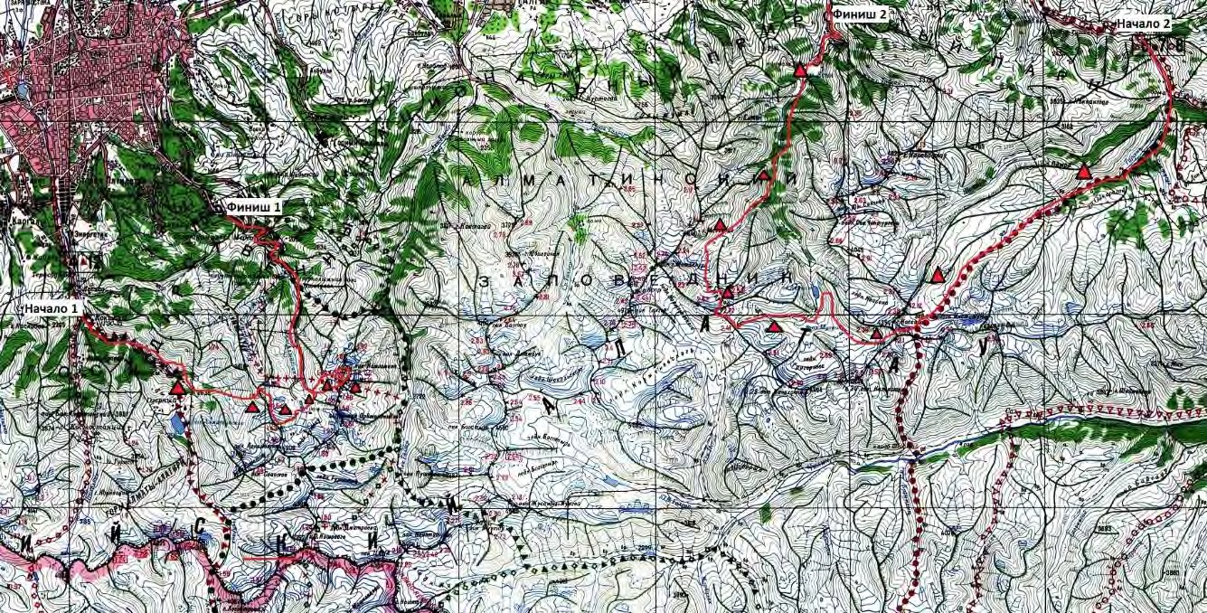 Г.Алматы-пос.Батан – ущ. Тургень – лед.Горного Института – пер.Пальгова 1Б, 4200м, - лед Пальгова – ущ.Иссык – пер.Кокбулак 1А, 4000м, - пик Кокбулак 1Б, 4500м, - пер.Траверсный 2Б, 4430м – ущ.Жарсай – ущ.Иссык – оз.Иссык – г.Алматы