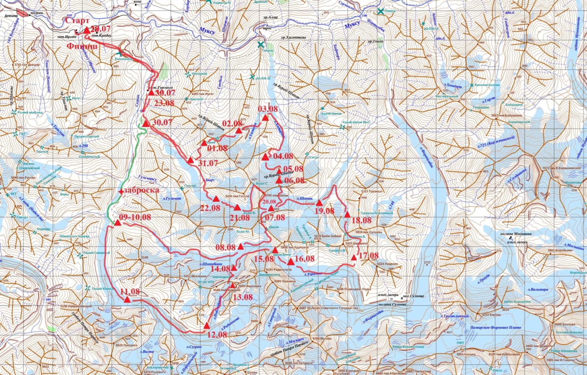 За пять дней до выезда, нам сообщили представители Pamir Peaks, что заброски в МАЛ на ледник Москвина не будет. Менять ранее построенный линейный маршрут было не когда. В итоге нитку маршрута построили из того, что было в качестве основного и запасного варианта, что было согласовано с ЦМКК. Пройденный маршрут, был построен из акклиматизационного и основного кольца.