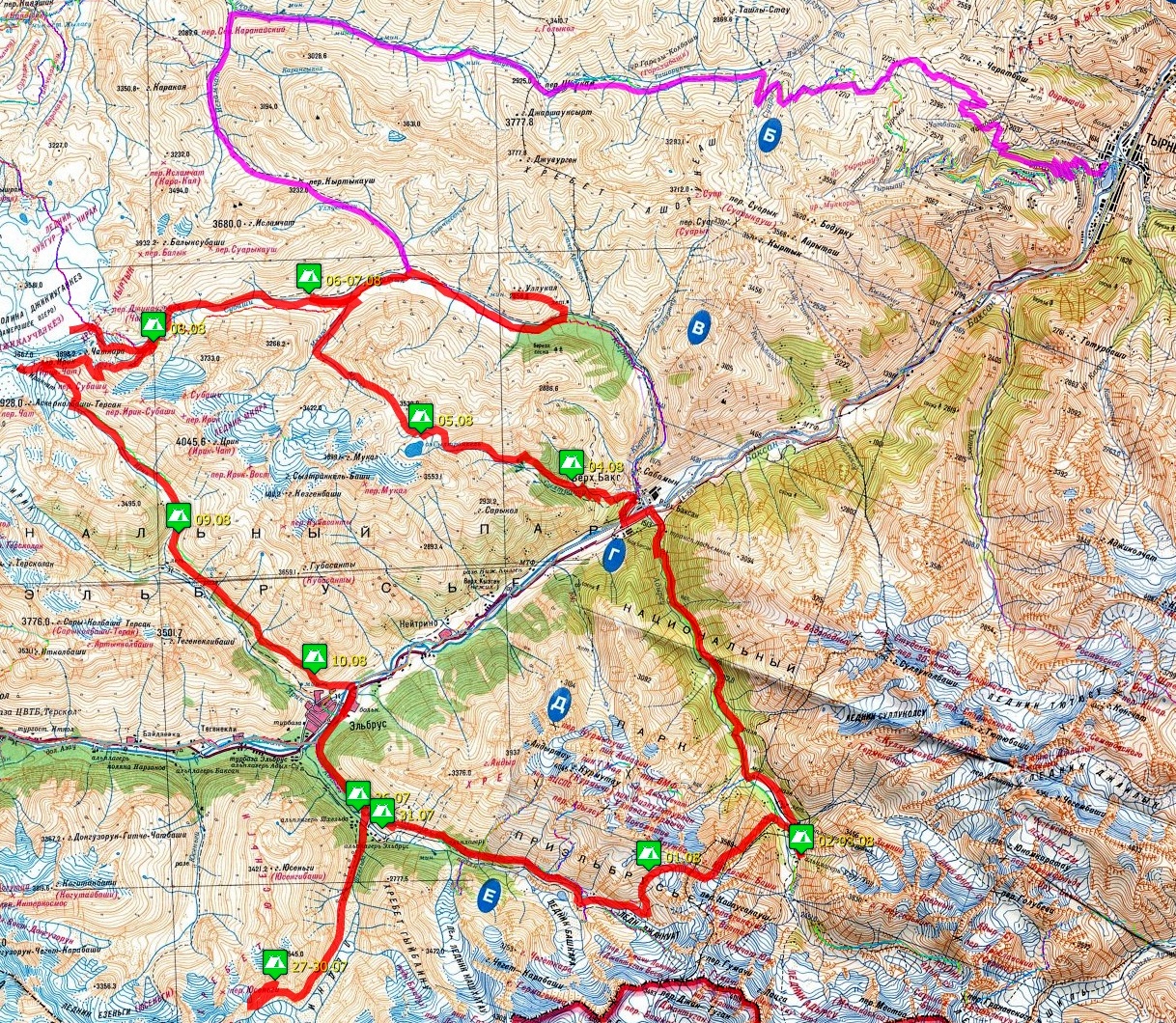 Заявленный маршрут: Пос. Эльбрус - а/л Шхельда - ночевки Аристова - а/л Эльбрус - д.р. Адылсу – «Спартаковские ночевки» - пер. Койавганауш (1А, 3500) - а/л Уллутау - д.р. Адырсу - пос. Верхний Баксан -д.р. Сылтрансу - оз. Сылтранкёль - пер. Сылтран (н/к, 3400) - д.р. Мукал - д.р. Мкяра - д.р. Субаши - пер. Джикаугенкёз (1А, 3520, рад.) - траверс пер. Субаши (3719) - в. Чаткара (3898 ) - пер. Ирикчат (3667) (1А) - д.р. Ирик - пос. Эльбрус