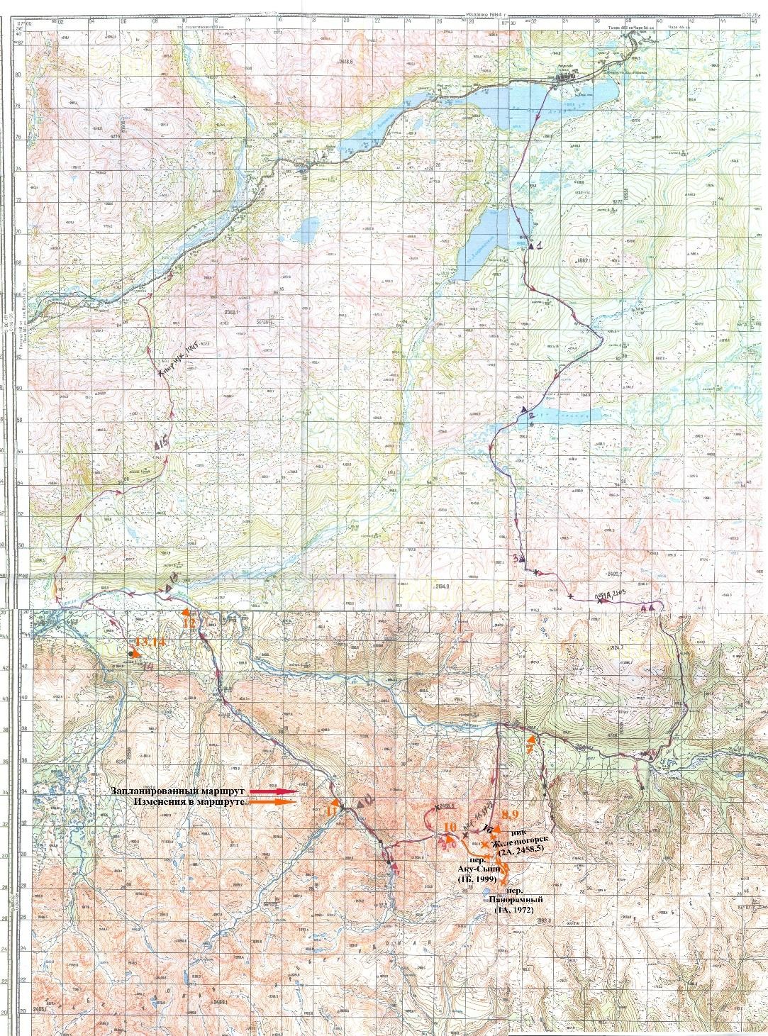 Подъем следует вести с крайней осторожностью. Попадаются кулуары, обрывающиеся крутыми уступами. Из-за крутизны склона закрепили перильную страховку 50 метров. Последние 100 метров перед вершиной склон выполаживается и обрывается отвесно в сторону озера. Ветер не прекращается, порывы усиливаются. Из-за горизонта надвигается темный снежный фонт. Впереди напряженный спуск и путь до зоны леса, которой совершенно не видно и с горы. Спуск занял около 3 часов. Вечером решено назвать перевал Аку-Сыни (1Б, 1999м), пик Железногорск(2А, 2456,4м).