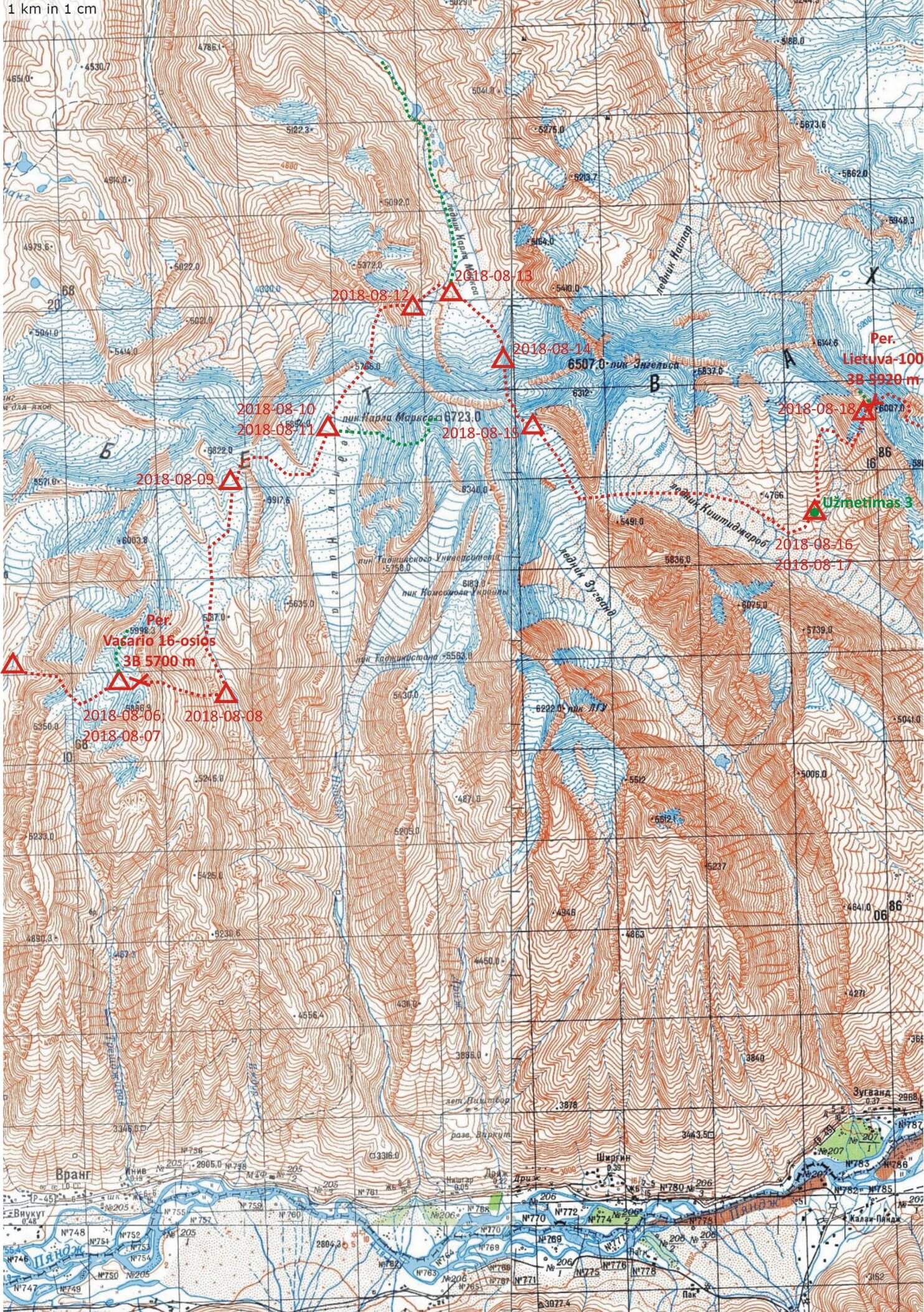 Собрав сильную, амбициозную и спортивную группу, в этом году нам удалось пройти горный поход самой высшей 6-ой категории сложности, богатый техническими и спортивными элементами. Всего мы прошли 11 перевалов и поднялись на 4 вершины. Пять из одиннадцати перевалов было пройдено впервые, именно поэтому мы решили их назвать литовскими именами: „Рагутис“ (4812 м, 1B), „Балтия“ (5040 м, 3A), „Жигейвю“ (5212 м, 2A), „16 Февраля“ (5700 м, 3B), „Литва-100“ (5920 м, 3B). Два последних перевала были оценены как высшей категории сложности, так как ранее каждый из перевалов был покорен с более простой стороны, но на сложную – Восточную сторону перевала никто до нас не спускался. Стоит выделить перевал „Зугванд“ (5600 м, 3B), который, насколько нам известно, со сложной северной стороны мы полностью прошли первые. Как это часто бывает, юго-западный Памир баловал нас хорошей погодой, поэтому нам удалось реализовать главную цель похода - новым маршрутом соединить два хребта с литовскими вершинами на юго-западном Памире и также в дополнение подняться на самые интересные для нас вершины: „Дарюс и Гиренас“ 6020 m, „Карл Маркс“ 6720 м, „Чюрленис“ 5807 м и „Литва“ 6080 м.