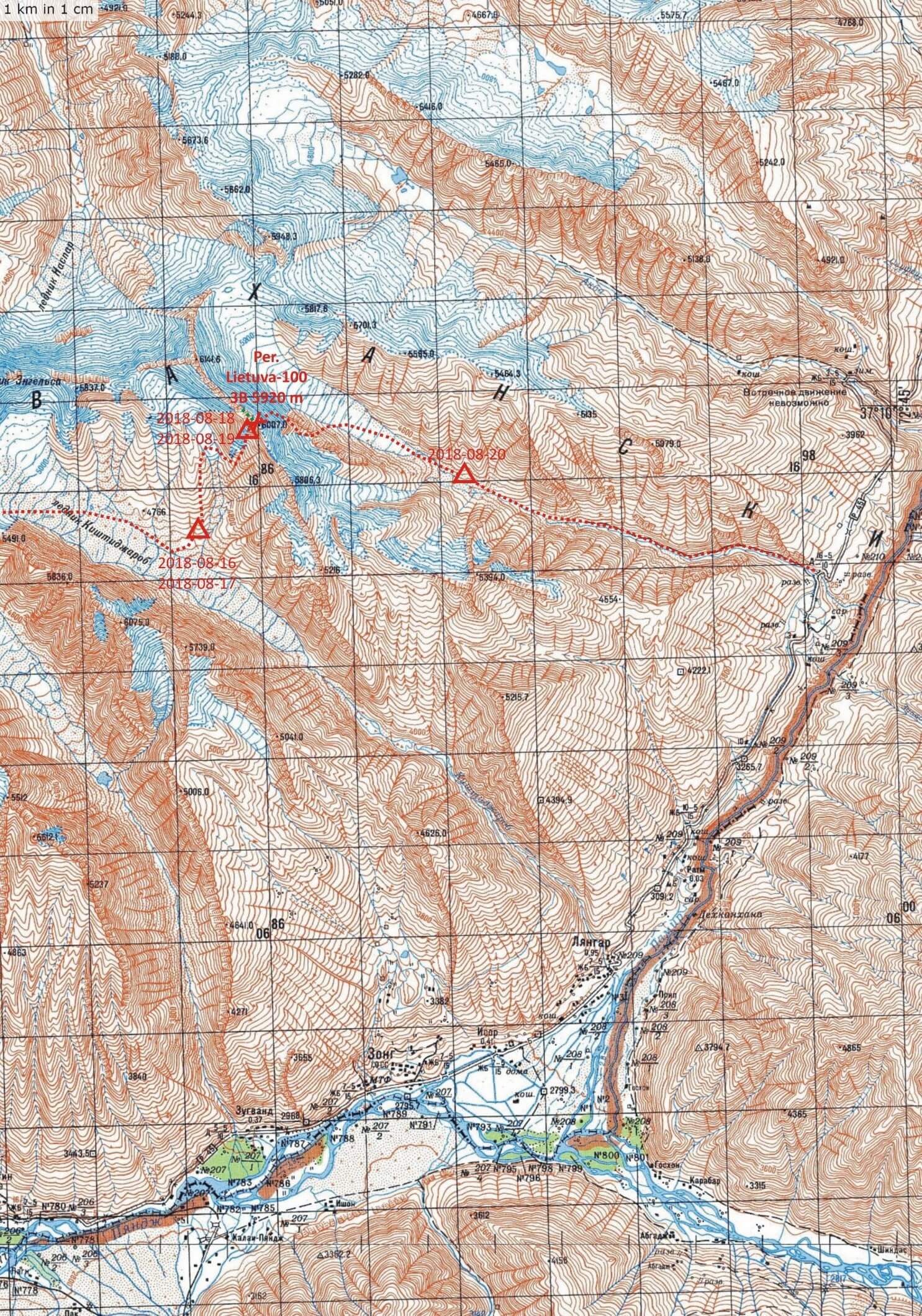 „Литва“. Поход мы запланировали в самой высокой части горного хребта Шахдара. Чтобы увидеть панорамы хребта со всех сторон мы решили начать поход со стороны долины Шахдара, пройти сквозь горы, которые нас интересуют, главный горный хребет пересечь несколько раз и спуститься к реке Пянж, протекающей по Таджикско-Афганской границе. Горный хребет Шахдара является самым южным горным хребтом Памира. Район славится хорошей погодой – практически нет летних осадков, что гарантирует небольшое количество снега в этом районе, хотя средняя высота хребта составляет 5600 м, а высота самой высокой вершины Карла Маркса - 6720 м.