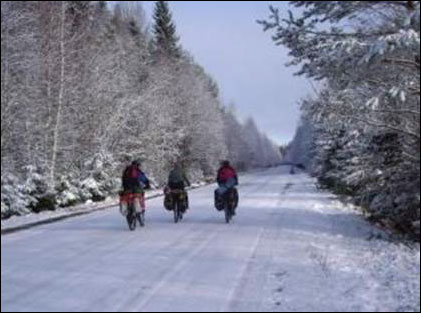 В тот день мы «отмахали» около 70 км. Часть пути была проделана уже в темноте, когда дорога стала идти по горам вверх-вниз. Выяснилось, что если на спуске тормозить, то велосипед теряет устойчивость и появляются все шансы улететь с дороги в кювет. А если не тормозить, то велосипед набирает скорость и устойчивость возрастает. Самая же большая устойчивость возникает, если при спуске еще крутить педали! Тогда все ледяные колдобины пролетаешь (в хорошем смысле этого слова) «лётом»! Правда, занятие это не для слабых нервов.