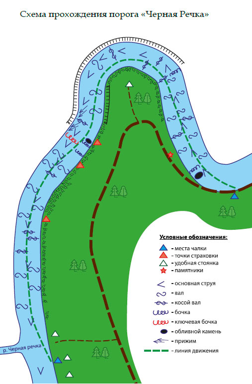 За бочкой идет серия прямых валов высотой до 1,5 м. Затем река становится шире, валы слабее. Через 300 м. от правого поворота справа впадает бурный правый приток – Черная речка. Напротив притока место для чалки и лагеря.