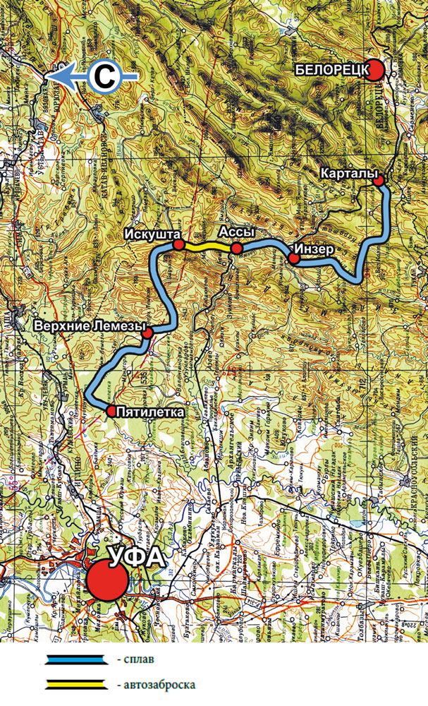 Было решено начать маршрут с поселка Карталы, пройти Б. Инзер до поселка Ассы и оттуда переброситься на Лемезу. Что и было сделано.