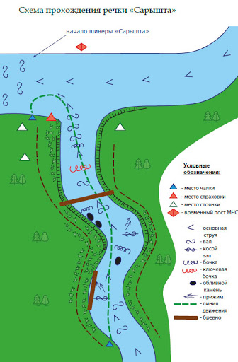 Линия движения наметилась ближе к левому берегу, у правого (более высокого) берега много подводных камней. Сразу за левым поворотом прижим к сучковатому бревну, лежащему на урезе воды. Избежать навала можно только уйдя вправо на середину реки, но при этом маневре струя выносит на обливняк как раз в середине потока. Дальше река поворачивает налево, здесь тоже лучше держаться левого берега. Через 30 м. поперек реки лежит бревно. Проход под бревном у правого берега, правый конец бревна поднят выше. В 10 м. за бревном ключевое препятствие – не сильно держащая бочка, следом еще одна, поменьше – проносная. Далее по цепочке валов высотой до 0,5 м лодку выносит в Лемезу, основная струя уходит влево. Здесь мы поставили страховку. Если заплывающего не выловить здесь, то метров через 40 он уйдет в шиверу Сарышта со всеми вытекающими последствиями.