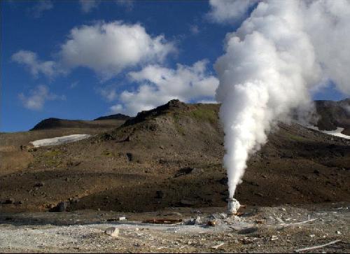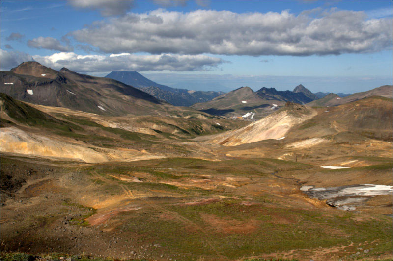 К 13:30 вышли к Дачным источникам (спуск к ним начинается с точки R-DACHN-DOWN). Там полно купающегося народа, останавливающегося рядом с ГеоТЭС. Бросив рюкзаки наверху, сходили к источникам; вернулись к рюкзакам, прошли дальше и по неприятной тропе проломились сквозь кусты вниз (наверное, лучше было всё-таки через источники); около "гостиницы" (заметное круглое здание R-GEO-OBSCH, также известное как "домик Чубайса") можно подняться к ГеоТЭС. Там нам объяснили, что это не гостиница, а общежитие, в частности, пообедать там невозможно. Говорят, с севера через проходную ГеоТЭС не пускает охрана, но со стороны гостиницы можно спокойно пройти через территорию, никто не обижается. Пообедав разведённым сублетворогом, в 15:30 отправились дальше; не доходя до проходной, повернули в R-22-RAZV1 на дорогу направо; немного не доходя до другого отделения ГеоТЭС, напротив очередной скважины-домика R-22-RAZV2 повернули направо на дорогу, ведущую в долину р. Мутновской. Дороги все хорошие, джипы по ним проезжают :) На спуске к Мутновской пару раз навернулись: глина очень скользкая. Дорога идёт то вверх, то вниз, так что, несмотря на спуск, некоторый набор высоты имеется.