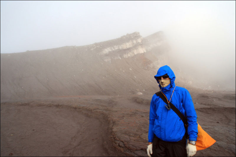Прогноз погоды был по-прежнему неясным, так что с утра мы решили поскорее подняться к кратерам - тем более, что на нашей высоте было видно голубое небо. Вышли в 7:45. Подъём практически по тропе, но можно идти и без неё. Край внешнего кратера исключительно скользкий; к счастью, ветер (сильнейший!) сдувал не в кратер, а наоборот (а то можно было бы легко оказаться внутри; скалы же исключительно отвесные!). Идти удобнее не по гребню, а чуть пониже, но тогда, конечно, не уловить моментов, когда ветер сдувает облачность и становится что-то видно. К сожалению, в основном видимость была минимальной; мы стали обходить вулкан вокруг против часовой стрелки в надежде, что с какой-нибудь стороны погода будет получше. В таких условиях было удобнее всего идти по рельефу, заблаговременно загруженному в GPS (не путать с генштабовкой!).