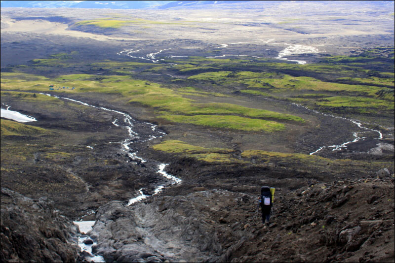 Ночевали в том же месте, ветер там довольно сильный (только отвернёшься - миска уже полна вулканическим песком), но палатка показала себя надёжной (если не уверены в своей палатке - не ставьте её там!). Временами дует сероводородом (ощущается даже в палатке), ночью приходила, по-видимому, лиса, погрызла оставшийся снаружи пакетик из-под сублемяса. За время стоянки в этом странном месте у нас заржавело всё металлическое, что могло и что не могло...