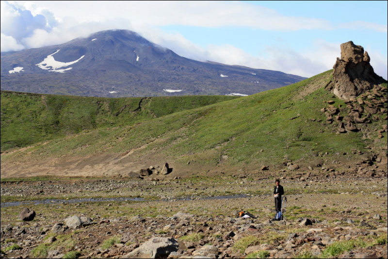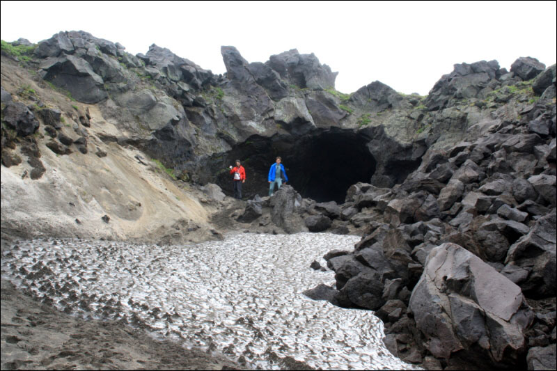 К вечеру ручьи становятся гораздо более полноводными, а при другой климатической обстановке в этих местах наверняка мокрее (чего и боялся наш водитель) и лежит снег. Уже недалеко от пещер мы нагнали автобус с "туристами выходного дня" (мы спустились вниз как раз в момент, когда он проезжал развилку), которые любезно подвезли нас последнюю пару километров, благодаря чему, в частности, нам не пришлось выбирать нужное ответвление от основной дороги и искать пещеры. В интернете нам удалось найти относительно точные координаты только одной из пещер - в английской аннотации к японской (!) статье по минералогии. К счастью, на местности пещеры неплохо видны, да они там практически под каждым камнем; некоторые координаты входов - точки R-CAVE63, ..., R-CAVE72, особое внимание стоит обратить на пещеры R-CAVE63 (грот с интересным ледяным полом, в нём имеется отверстие, как мы позже узнали, если спуститься пару метров по верёвке, можно попасть в следующий большой зал, слегка освещаемый дневным светом; мы не спускались), R-CAVE72 (довольно длинная пещера, по-видимому, имеющаяся в виду в "японской" статье). Тепло, переменная облачность, но на Горелом, конечно, сидит облако. С 13:00 до 15:45 осматривали пещеры. Обратно к развилке R-17-RAZV нас подвезли на том же автобусе, мы поднялись до наших рюкзаков и поставили лагерь неподалёку (точка R-17-CAMP). По дороге погода позволила посмотреть на вечерний Мутновский (фото 11).