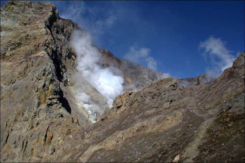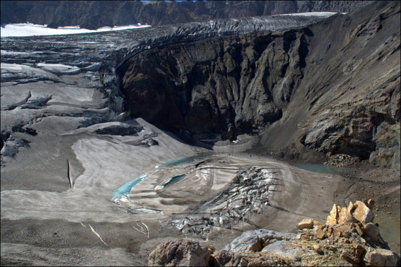 Добрались до хребтика и начали осмотр в 11:30, через некоторое время нас стали нагонять группы "выходного дня" и в 12:30 мы отправились обратно, ещё раз осмотрев по дороге фумаролы, "кипящие" котлы (ручей течёт по краю фумарольного поля и образует разные интересные объекты) и прочие вулканические удовольствия. Над кратерами нависают остатки ледника, он весь в трещинах и местами голубой (увеличенный фрагмент - на фото ) и искрится на солнце. Вход в кальдеру (русло р. Вулканной) состоит из разноцветных скал и очень красив в хорошую погоду.