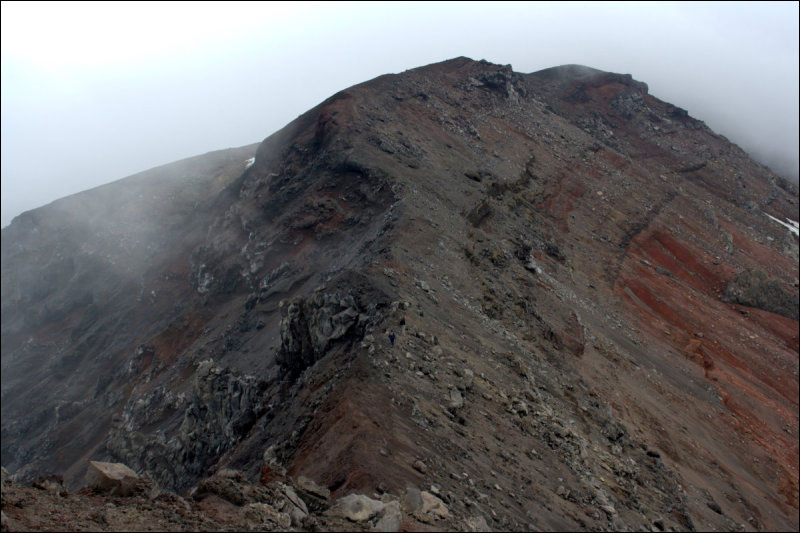 Поскольку полдня хорошей погоды ещё ожидалось, вышли пораньше (7:15), надеясь успеть посмотреть на океан. Подъём начинается от хорошо заметного "пальца" (то есть, фактически, с перевала между Двугорбой и Мутновским), его мы обошли справа, дальше можно идти по хребту, обходя лишние подъёмы и редкие скальные вершинки. На хребте один цветной песок сменяется другим, особенно хорошо выглядит красный, марсианский... В точке R-21-HREB хребет становится очень узким (это хорошо видно на карте) и довольно крутым во все стороны; почва - сыпуха, не очень страшная, но неопытных людей без наблюдения я бы туда не пускал - есть опасность скатиться под ледник.