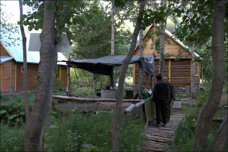 Завод по производству красной икры, который находился возле источников, был уничтожен лавиной зимой 2008/9 гг., сейчас там турбаза, которой заведует гостеприимный Ашот, так что мы были поселены в домик и потчеваны красочно оформленными кулинарными изысками (фото 64). Ашот в своё удовольствие занимается благоустройством тамошних источников (которые перестали быть первозданными не один десяток лет назад), так что искупаться можно в разных температурах и вариантах и с комфортом (кстати, источники располагаются на довольно большой территории). Судя по страшной скорости, с которой он всё делает (передвигается он исключительно бегом), ещё одно лето - и там будет олимпийская деревня. Кстати, он готов принять добровольных помощников :) Ещё там было две собаки, одна из которых нас периодически покусывала, намекая на то, что какие же туристы без колбасы; говорят, они и на медведей бросаются.