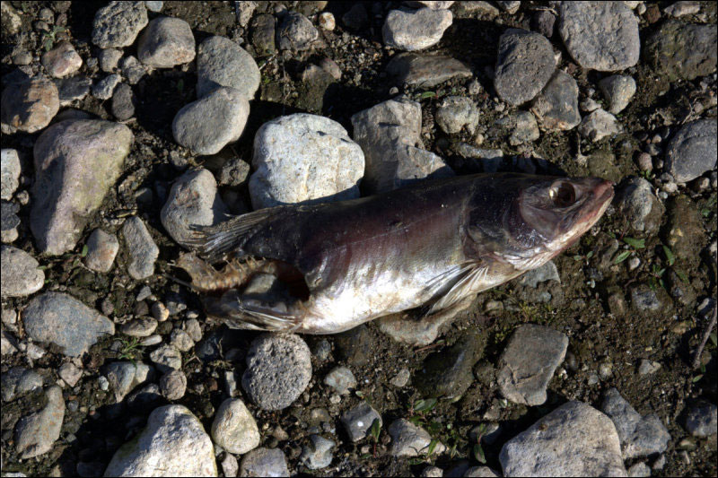 К 15:00 пришли в бухту (R-BUHTA). Дорога здесь раздваивается. В бухте есть два альтернативных места для стоянки: либо справа (дальше, начиная с R-BUHTA-R, имеются стекающие со скал ручьи, но нет рыбы и рыбаков), либо слева, в устье р. Жировой (там вода так себе из-за обилия дохлой рыбы в речке, по обоим сторонам реки имеются хибары рыбаков, но они не против такого соседства, их в сумме человек шесть), где мы и встали (R-23-CAMP). Поужинали упомянутой выше горбушей.