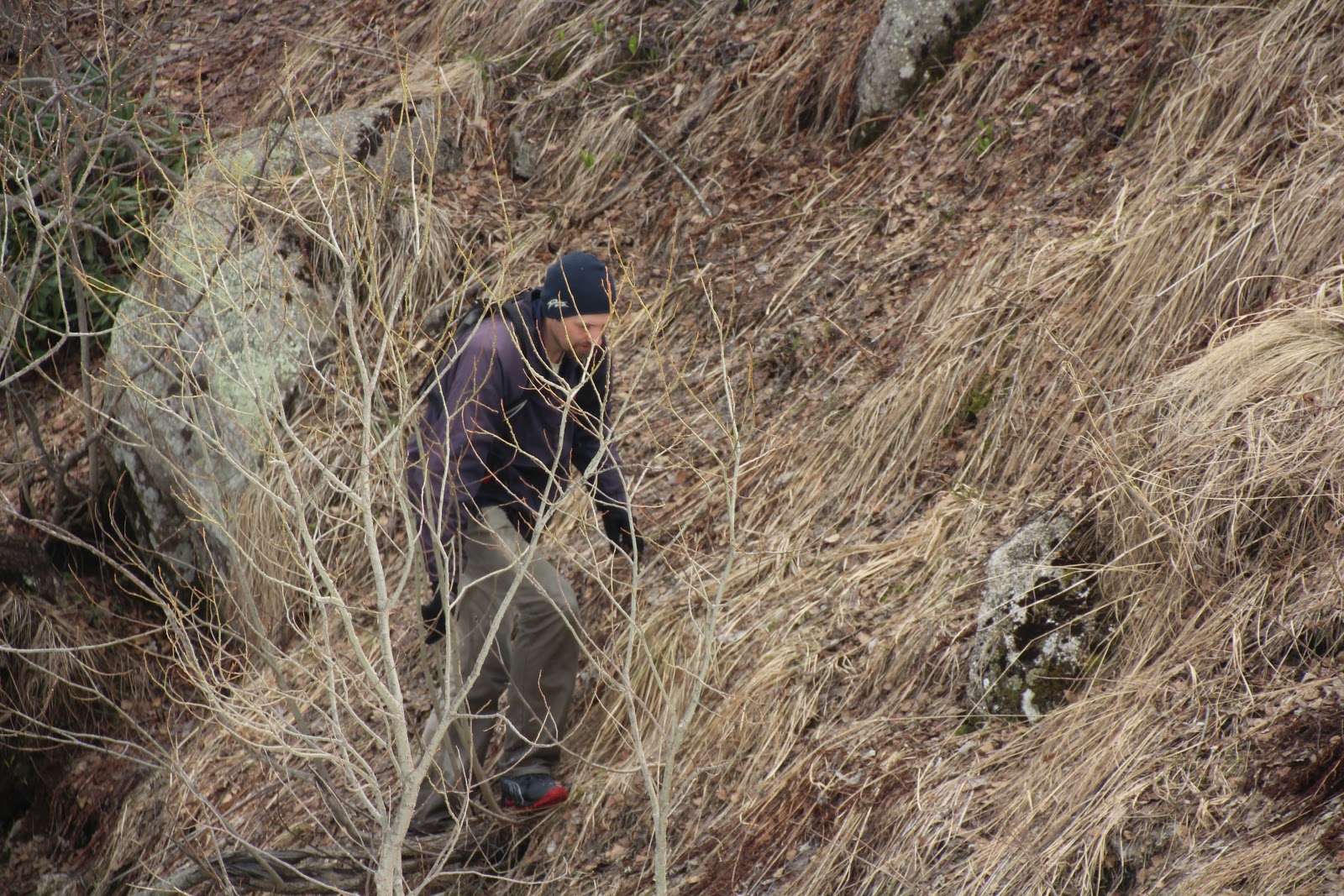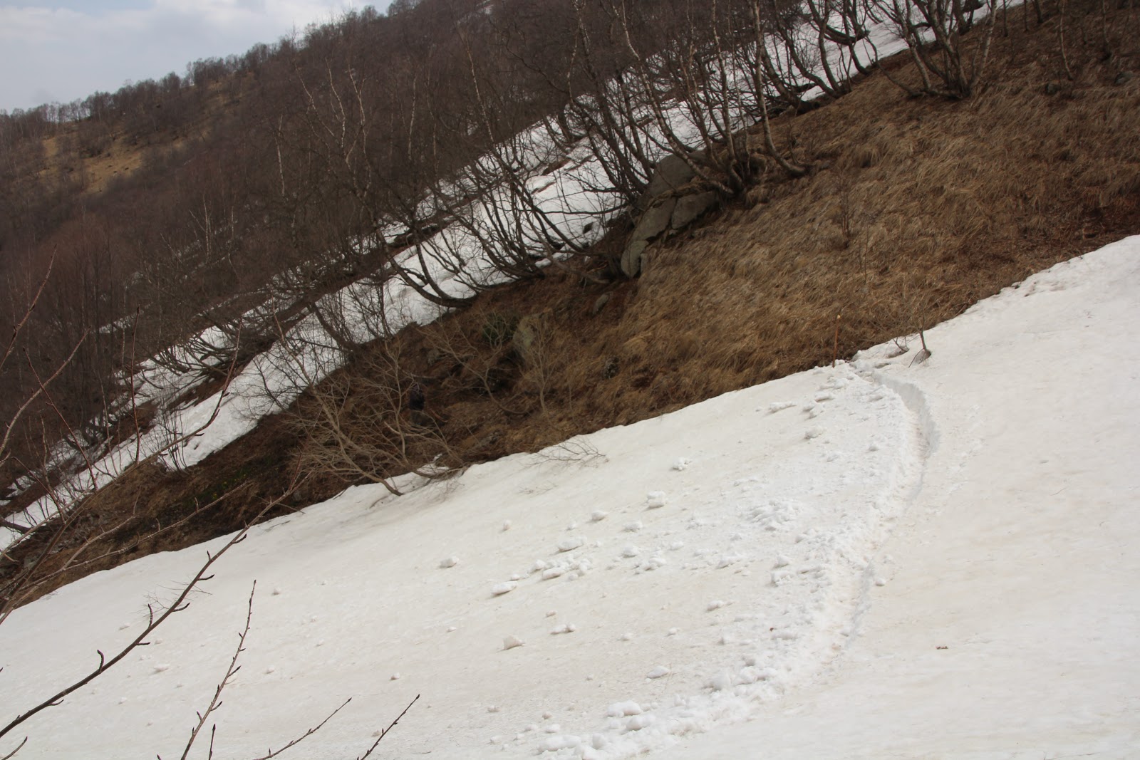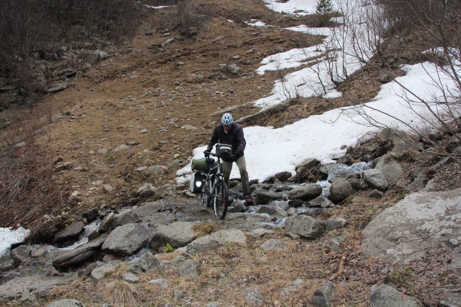 Дорога вниз  (а это северный склон) полностью завалена снегом, пройти по которому практически невозможно. Или это окаменевший наст, на котором в мягких кроссовках корова на льду покажется эталоном стабильности, или каша, на которой без предупреждения проваливаешься по пояс. Самым разумным было бы повернуть назад, но где мы, а где разум. Наметили траекторию спуска и, по возможности обходя снег, по мокрой траве, кочкам, камням начали челночить вниз. Спускаем метров на сто велосипед, назад за вещами, вниз, опять наверх за второй частью шмотья, снова вниз…