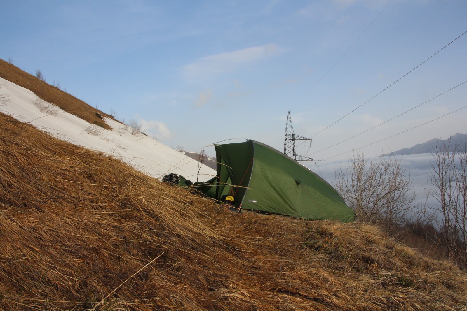 Палатку ставим на условно ровной полочке, но все одно спали полусидя.