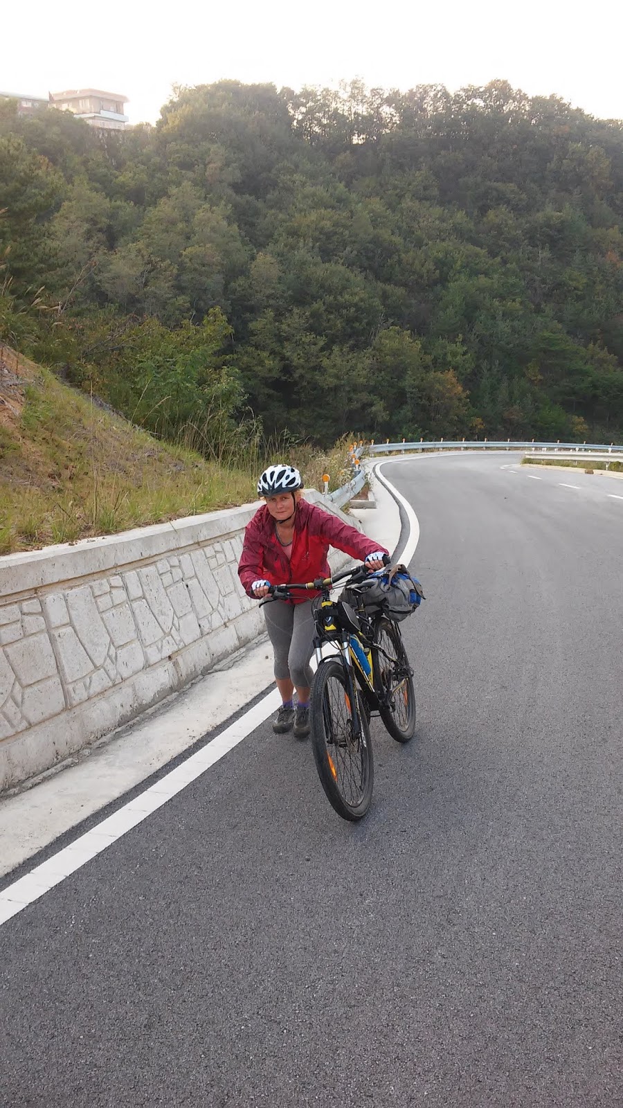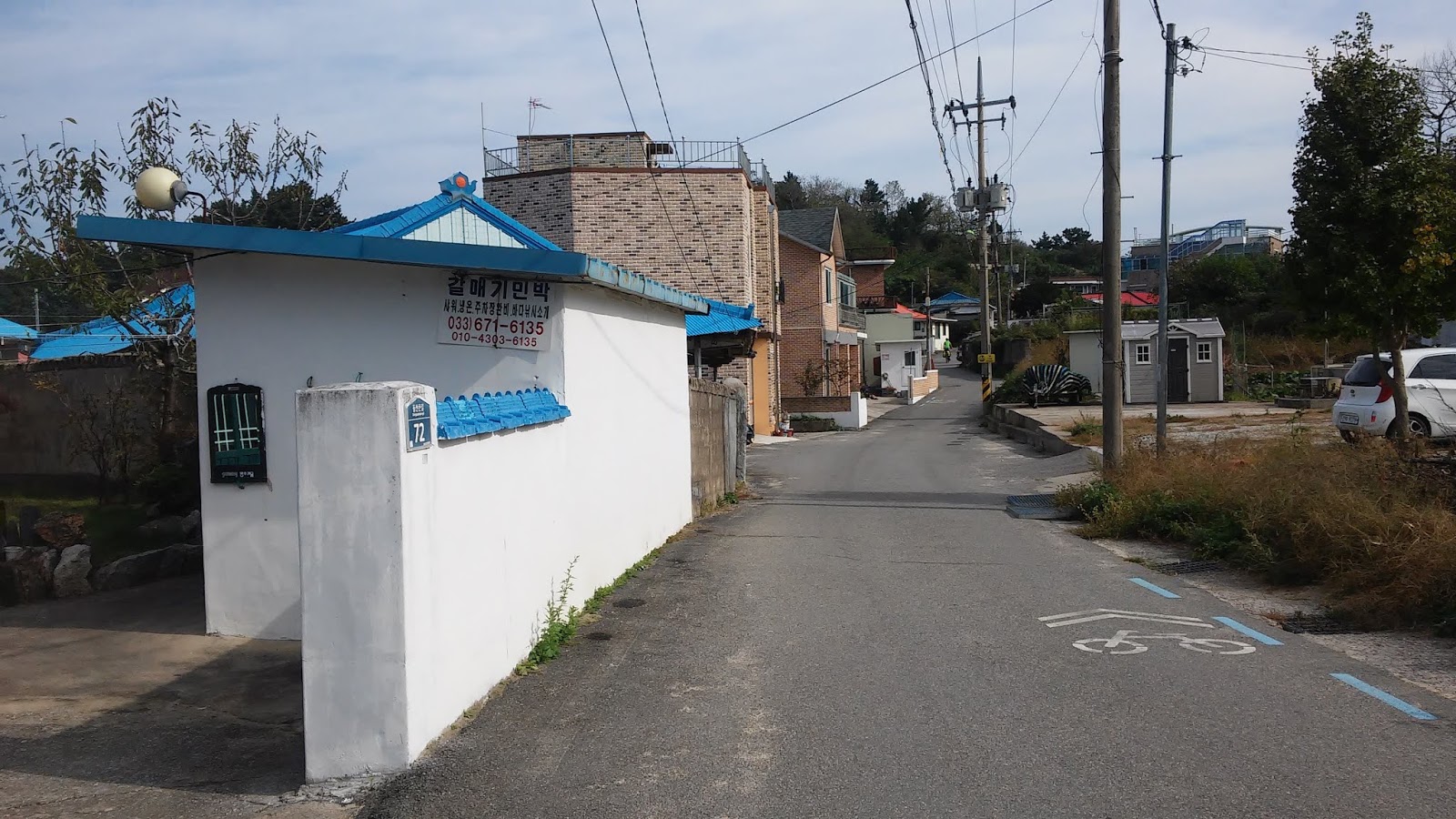 Перед последним перевалом закончилась Романическая дорога. И крутым подъемом началась новая, еще не открытая официально велодорога до Пусана. После этого перевала ехать дальше не было ни сил, ни желания. А совсем рядом, прямо на берегу, очень заманчиво пристроился нарядный пансиончик. Эх, 70 тыс за ночь. Такие расходы несколько не вмещались в наш бюджет. Но в итоге тяга к комфорту победила и мы остались.