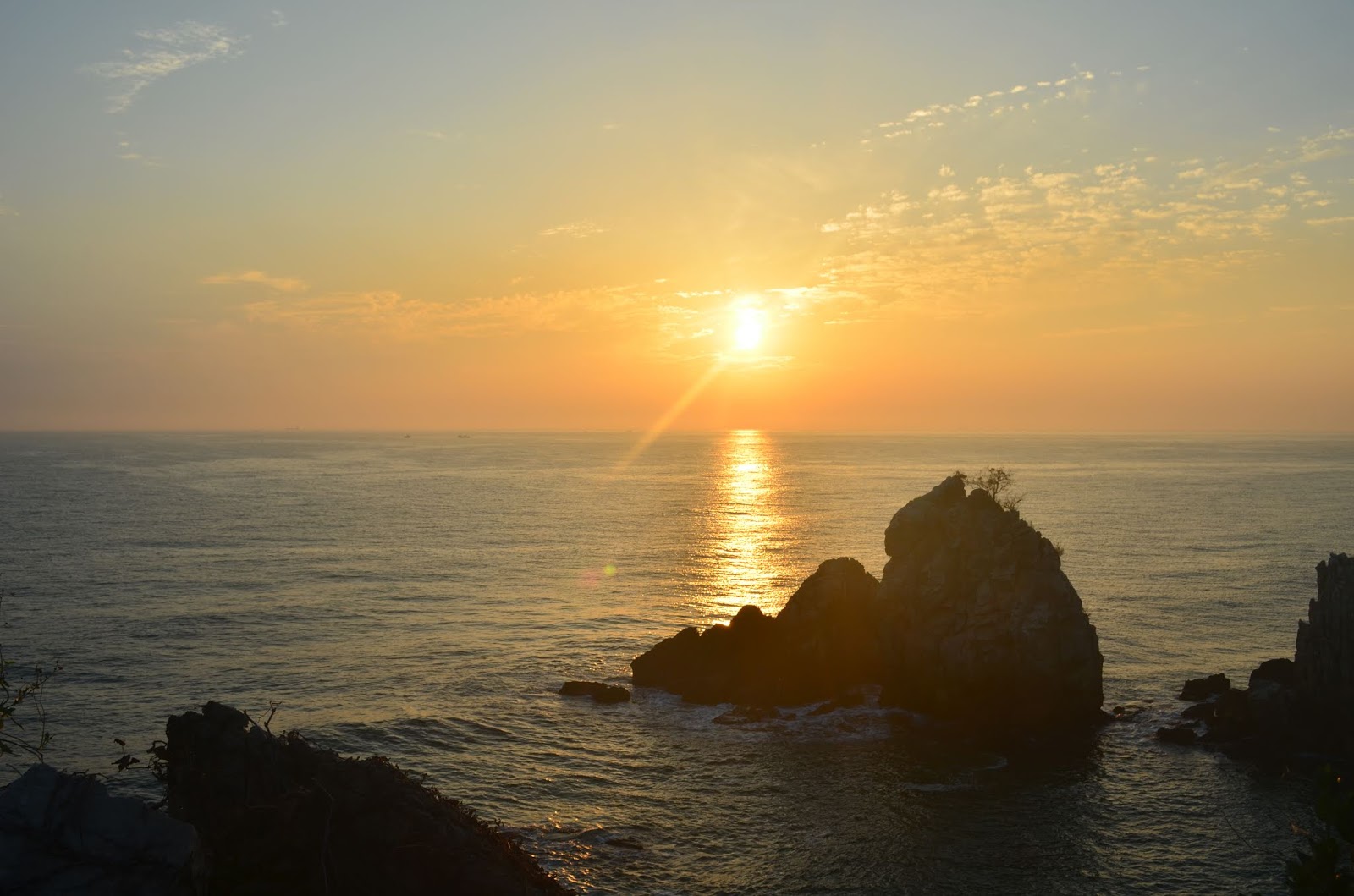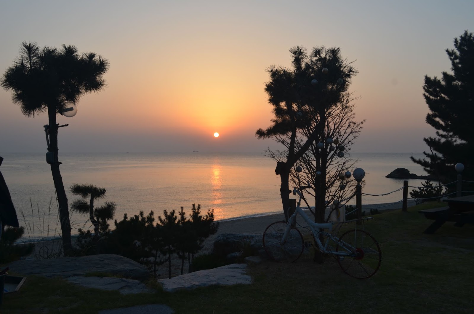 Ночевать мы планировали где-то на выезде из Донхе. И вот выезд уже превратился просто в дорогу без признаков жилья, стемнело, а мотели куда-то попрятались. В порыве энтузиазма Леха собрался ехать в темную неизвестность. К счастью я уточнила, как далеко в этой неизвестности до пляжа и скалы в виде подсвечника – довольно известная достопримечательность г. Самчок. Оказалось, что где-то слева и почти уже позади это местечко. «Поворачивай!» - раскричалась Катя, и мы поехали в сторону моря. Ведь если есть море, пляж, да еще и Sunrise Park (парк встречи рассвета), то обязано быть и жилье. Правда дорога была уж очень пустынной, темной и скрашивали смутное беспокойство лишь шуточки о том, что в велочехлах, в принципе, можно и переночевать, благо, дождик закончился. К счастью, предположения оправдались, дорога привела к пляжу, парку и пансионатам.