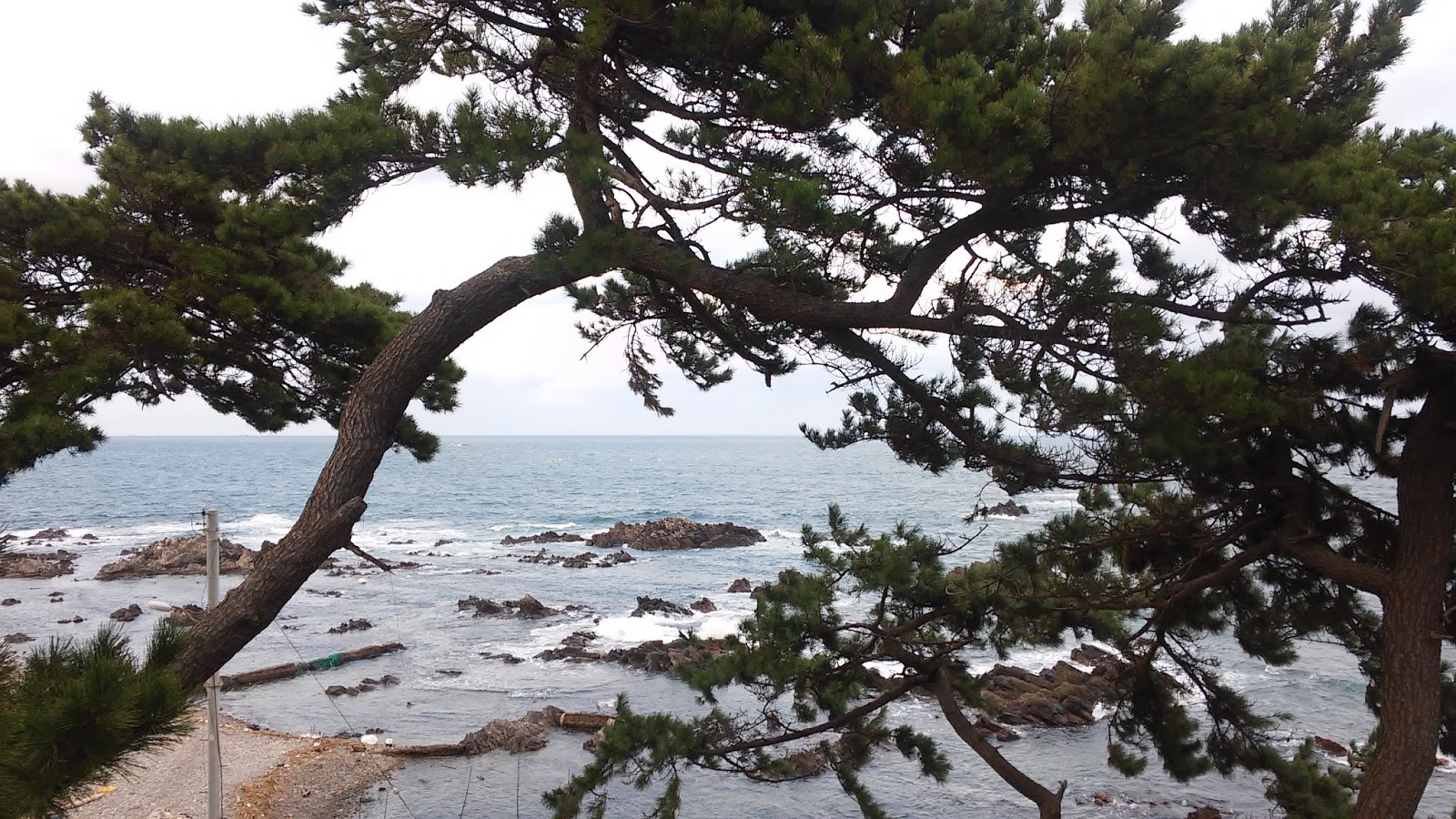 Другой дорогой был хайвей. Не самый страшный, трафик небольшой, платить за проезд не надо было, но все-таки, машинки летели с хорошей скоростью. По хайвею ехать хоть и немного страшно, но зато быстро, перевалов нет, останавливаться фотографировать нечего. Мы довольно скоро опять вернулись на велодорожку к побережью. Вернее это хайвей преобразовался в прибрежную дорогу, стал узким, а машины при этом никуда не делись. Ехалось, прямо скажем, некомфортно из-за машин и почти полного отсутствия обочины. Как будто и не Корея совсем. Но посмотреть все равно было на что.