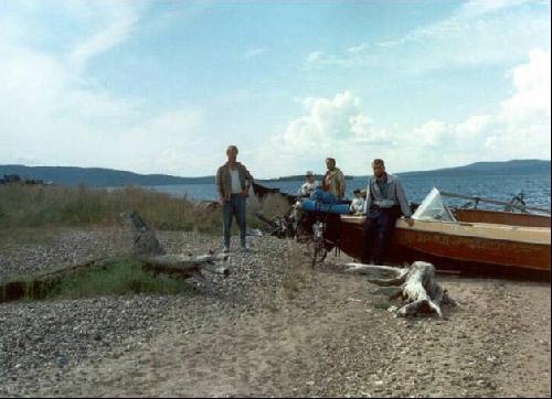 В 10:35 мы уже сидели в лодке и плыли в Зашеек. Сколько мы ни упрашивали мужика дать нам весла, он так и не послушался. В 12:05 мы стояли на песчаном берегу озера в деревне Зашеек. Ура! Большое Человеческое СПАСИБО этому человеку!